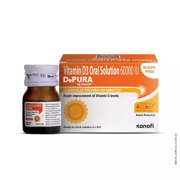 Depura Vitamin D3 60k Sugar-Free Oral Solution is a high-potency Vitamin D3 supplement designed to maintain strong bones and teeth by enhancing calcium absorption in the body. Its sugar-free formulation makes it suitable for individuals with diabetes or those monitoring sugar intake. Regular use may help prevent Vitamin D deficiency, support muscle function, improve immunity, and promote overall wellness. The 5ml oral solution provides an easy and accurate dosage, making it ideal for both adults and children under physician guidance.